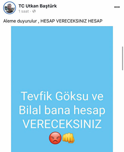 - Esenler Belediye Başkanı ve İBB AK Parti Grup Başkanvekili M. Tevfik Göksu’yu Facebook hesabı paylaşımlarıyla tehdit eden Utkan Baştürk’ün, Esenler Belediyesi Çağrı Merkezi üzerinden de tehdit ve hakaretlerde bulunduğu öğrenildi. Baştürk’ün, Esenler Belediye Başkan Danışmanı Abdullah Aksu’yla yaptığı görüşmede, Aksu’ya da tehdit, hakaret ve küfürler savurduğu öğrenildi.