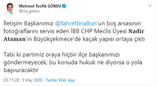 Cumhurbaşkanlığı İletişim Başkanı Fahrettin Altun’un Kuzguncuk’taki evinin olduğu arsada kaçak yapı olduğu iddiasıyla fotoğraf çektiren CHP'ye Esenler Belediye Başkanı Mehmet Tevfik Göksu Twitter hesabı üzerinden ders verdi. Göksu, İBB CHP Meclis Üyesi Nadir Ataman'ın Büyükçekmece'de kaçak yapısı olduğunu belirterek "Tabi ki partimiz oraya hiçbir ilçe başkanımızı göndermeyecek, bu konuda hukuk ne diyorsa o yola başvuracaktır" ifadelerini kullandı.