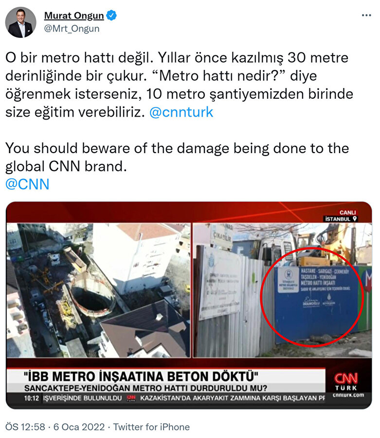 İBB Sözcüsü Murat Ongun ise şantiye alanında bulunan İBB Başkanı Ekrem İmamoğlu imzalı 'Metro hattı inşaatı' yazısına rağmen