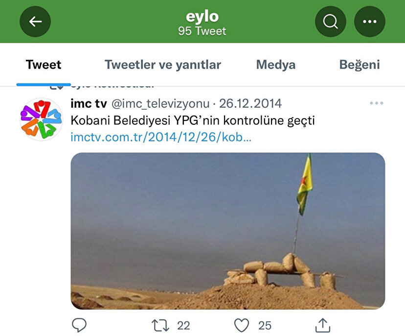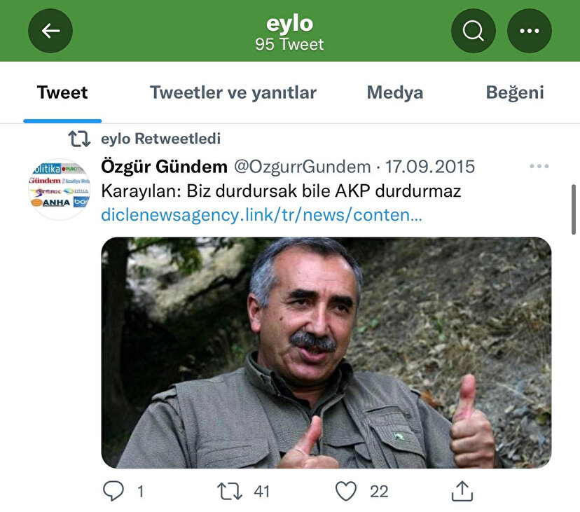 Paylaşımlardan birinde YPG'nin işgaline dair haberin retweet edildiği görülüyor. Diğerinde ise terörist elebaşı Murat Karayılan'ın terör propagandası yaptığı sözleri paylaşılmış.