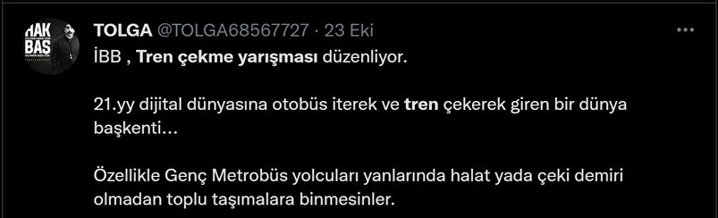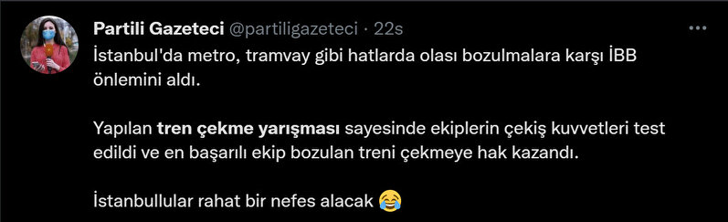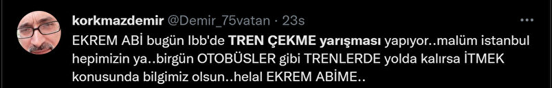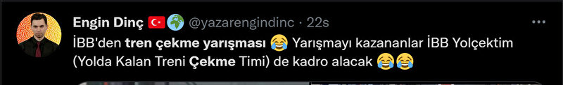 "CHP'li İBB yönetimi, tren çekme yarışması düzenliyor. İETT'den de "Otobüs İttirme Yarışması" bekliyoruz. Zira İstanbullular oldukça antrenmanlı."