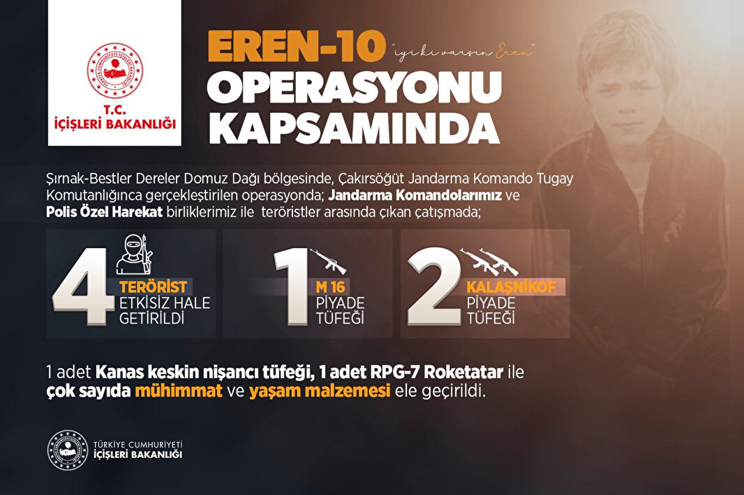 İçişleri Bakanı Süleyman Soylu, "Eren-10 Operasyonu kapsamında; Şırnak-Bestler Dereler Domuz Dağı bölgesinde, Jandarma Komandolarımız ve PÖH birliklerimiz ile teröristler arasında çıkan çatışmada 4 terörist, silahlarıyla birlikte etkisiz hale getirildi" dedi.