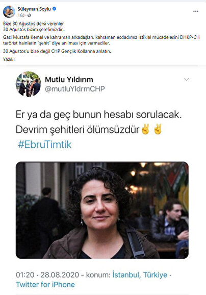 CHP Gençlik Kollaro üyesi Murat Yıldırım'ın sosyal medya üzerinden DHKP-C'li Ebru Timtik için kullandığı 'şehit' ifadesine İçişleri Bakanı Süleyman Soylu tepki gösterdi. Bakan Soylu, sosyal medya hesabından paylaştığı mesajda, "Gazi Mustafa Kemal ve kahraman arkadaşları, kahraman ecdadımız, İstiklal mücadelesini DHKP-C'li terörist hainlerin 'şehit' diye anılması için vermedi" ifadeleri ile tepkisini dile getirdi.
