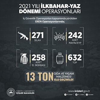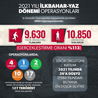 Bakanlıktan yapılan yazılı açıklamaya göre, iç güvenlik operasyonları kapsamında Jandarma Komando, Jandarma Özel Harekat (JÖH), Polis Özel Harekat (PÖH) ve güvenlik korucularının katılımıyla yürütülen 'Eren' operasyonlarının, 15 Nisan'da başlatılan ilkbahar-yaz dönemi ayağı başarıyla tamamlandı. İlkbahar-yaz döneminde 9 bin 630 terör operasyonu planlanırken, 10 bin 850 operasyon gerçekleştirildi.