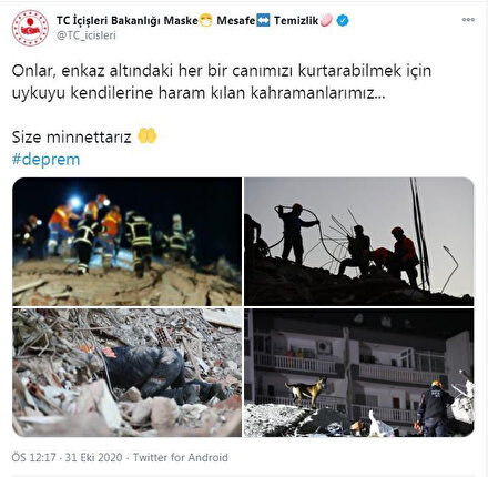 İçişleri Bakanlığı'nca, İzmir'deki depremde enkaz altında kalan vatandaşlara ulaşabilmek için mücadele eden AFAD ekipleri için, "Onlar, enkaz altındaki her bir canımızı kurtarabilmek için uykuyu kendilerine haram kılan kahramanlarımız" mesajı paylaşıldı.