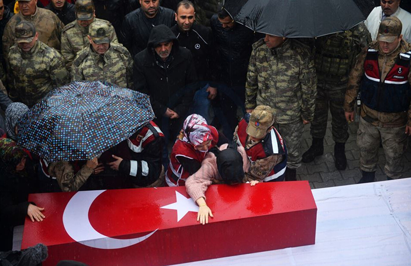 Suriye'nin İdlib kentinde rejim unsurlarının hava saldırısı sonucu şehit olan askerler son yolculuklarına uğurlanıyor.