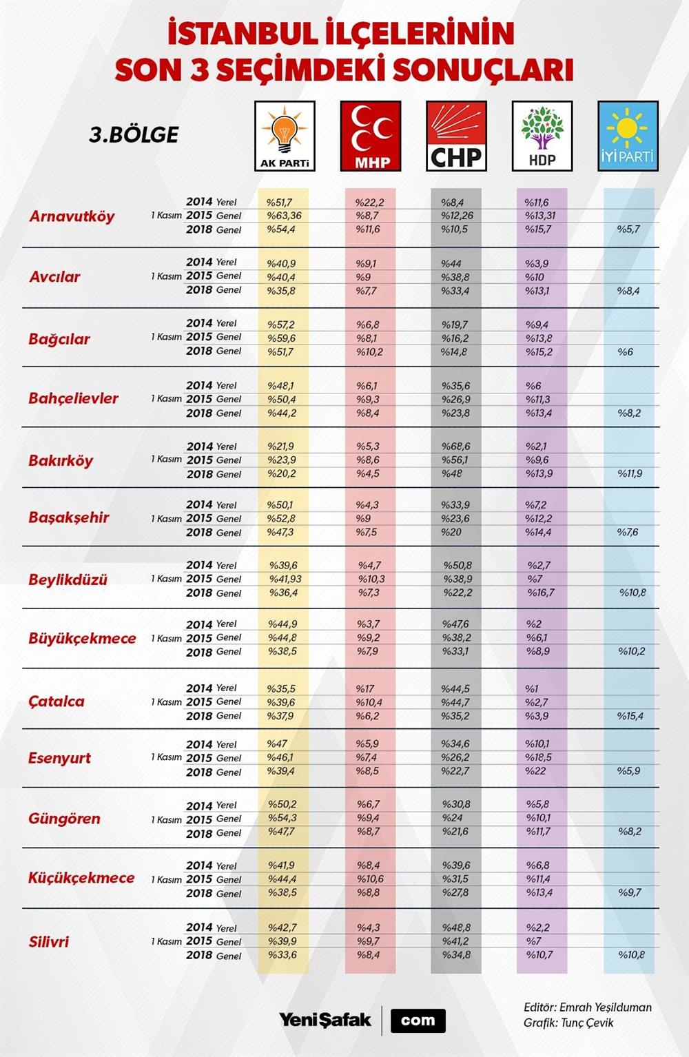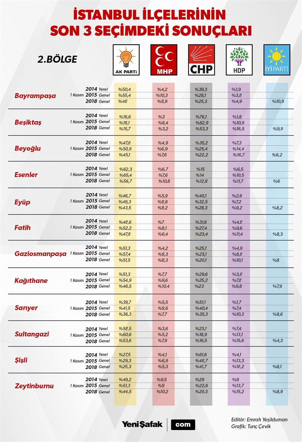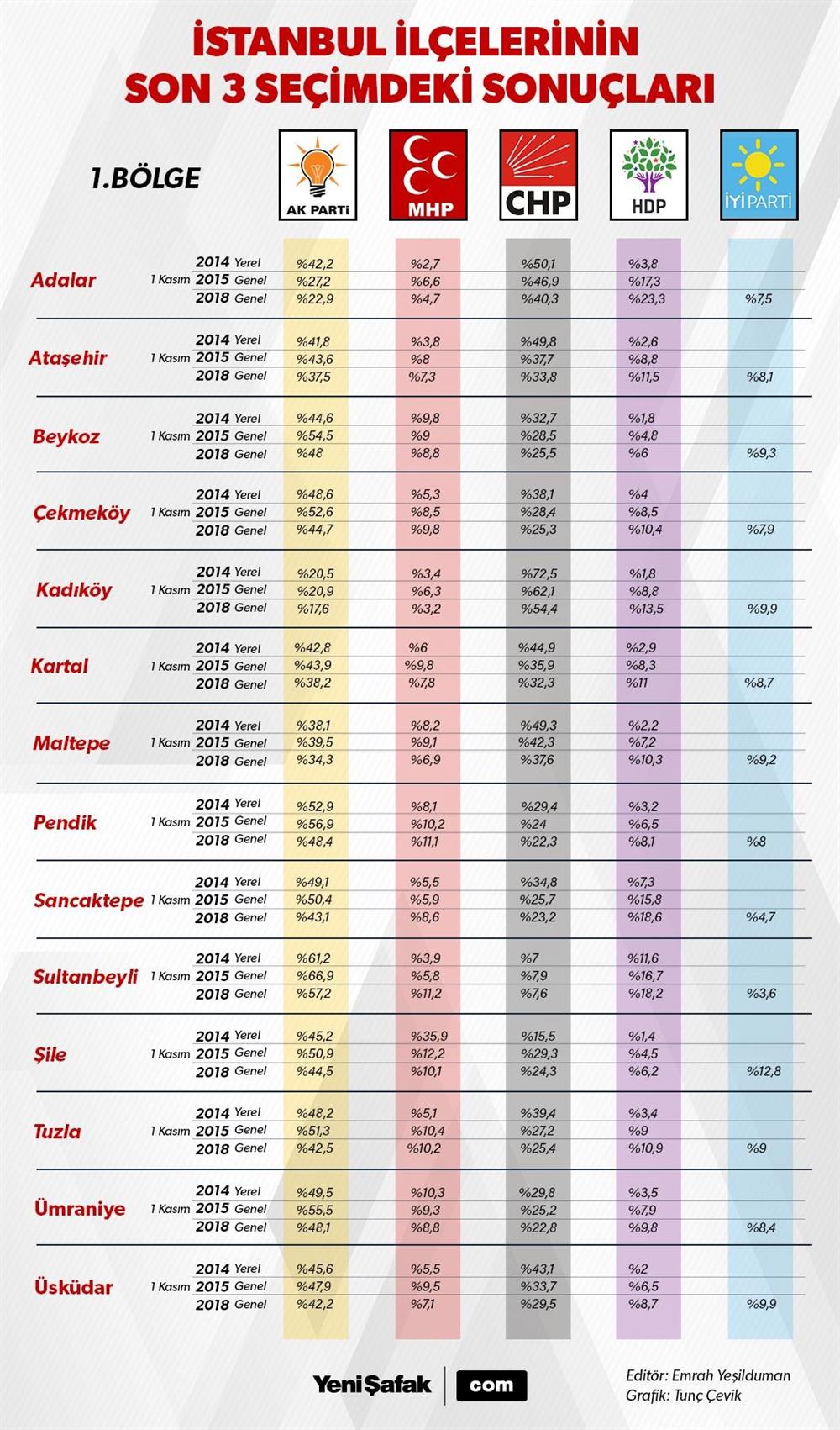 İstanbul geneli ve 39 ilçede partilerin son 3 seçimde aldığı oylar tablolu bir şekilde karşılaştırıldığında çıkan detaylar yerel seçimler için de ipuçları veriyor. İstanbul’da 25 AK Partili, 14 CHP’li ilçe belediyesi bulunuyor. İBB de 2004’ten bu yana AK Parti yönetiminde. Son seçimlerdeki oy değişkenlikleriyle birlikte 2019’da yapılacak yerel seçimler öncesi büyük önem arz etmeye başladı. İstanbul’da kıyasıya yarışacak partiler, seçmenlerin eğilimlerini yakalayabilmek yoğun bir mesai harcayacak. Son seçim sonuçlarını analiz ettiğimizde hangi bölgelerde kıyasıya bir seçim yarışının geçeceği de ortaya çıkıyor.