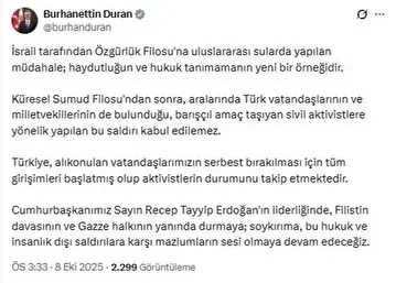 İletişim Başkanı Burhanettin Duran, Gazze'ye yardım götüren Özgürlük Filosu'na İsrail'in uluslararası sularda yaptığı müdahaleye ilişkin, sosyal medya hesabından açıklama yaptı. Duran, "İsrail tarafından Özgürlük Filosu'na uluslararası sularda yapılan müdahale, haydutluğun ve hukuk tanımamanın yeni bir örneğidir. Küresel Sumud Filosu'ndan sonra aralarında Türk vatandaşlarının ve milletvekillerinin de bulunduğu, barışçıl amaç taşıyan sivil aktivistlere yönelik yapılan bu saldırı kabul edilemez.