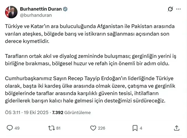Cumhurbaşkanlığı İletişim Başkanı Burhanettin Duran, sosyal medya hesabından yaptığı paylaşımda, Türkiye ve Katar'ın ara buluculuğunda Afganistan ile Pakistan arasında varılan ateşkesin, bölgede barış ve istikrarın sağlanması açısından son derece kıymetli olduğunu vurguladı.