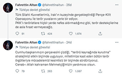 Türk Silahlı Kuvvetleri'nin Kuzey Irak'ta gerçekleştirdiği operasyona binaen paylaşımda bulunan İletişim Başkanı Fahrettin Altun, "Türk Silahlı Kuvvetlerimiz, Irak’ın kuzeyinde gerçekleştirdiği Pençe-Kilit Operasyonu ile terör yuvalarını yerle bir ediyor.