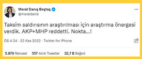 "İddiaya konu önerge, HDP Grup Başkanvekilleri Meral Danış Beştaş ile Hakkı Saruhan Oluç imzasıyla, 'İktidarın Suriye Dış Politikası bağlamında ÖSO-HTŞ vb. yapılarla olan ilişkileri ve bunun siyasal-toplumsal etkilerinin ortaya çıkarılması amacıyla Anayasa'nın 98'inci, İçtüzüğün 104 ve 105'inci maddeleri uyarınca Meclis Araştırması açılmasını arz ve teklif ederiz' şeklinde sunulmuştur. Saldırının faili Ahlam Albashır'ın, terör örgütü PKK/YPG bağlantılarını itiraf etmesine rağmen önerge, okları PKK/YPG üzerinden çekmek amacıyla Suriye'deki başka örgütlere çevrilmeye çalışmıştır. Ayrıca 27. Dönem 6. Yasama Yılı 24. Birleşim 23 Kasım 2022 Çarşamba tutanağı incelendiğinde, Beştaş'ın yine Türkiye'nin ÖSO ve HTŞ ile ilişkilerinin araştırılmasını istediği belirlenmiştir."