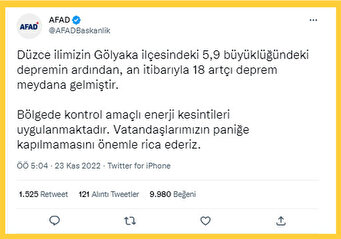 Dezenformasyon Bülteni'nde, Düzce'nin Gölyaka ilçesinde meydana gelen 5,9 büyüklüğündeki depremin ardından bazı sosyal medya kullanıcılarınca paylaşılan "Elektrik altyapısı çöktü" iddiasının doğru olmadığı, deprem sonrası yaşanan elektrik kesintisinin, tamamen kontrollü bir kesinti olduğu vurgulandı.