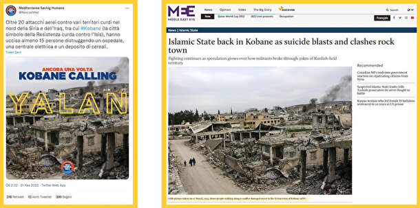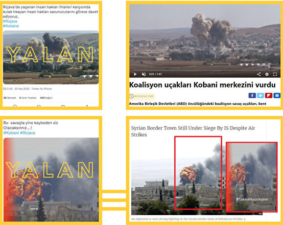 "PKK'nın propaganda araçlarının, 'Türkiye, Ayn el Arap'taki sivil yerleşim alanlarını vuruyor' iddiasıyla paylaştığı görüntüler, ABD öncülüğündeki koalisyonun DEAŞ'la mücadele kapsamında, 2014'te Ayn el Arap'a gerçekleştirdiği hava bombardımanına aittir. Paylaşılan bir diğer görüntü de yine 2014'te terör örgütü DEAŞ'ın kontrolünde olan kente yönelik koalisyon hava bombardımanını göstermektedir."