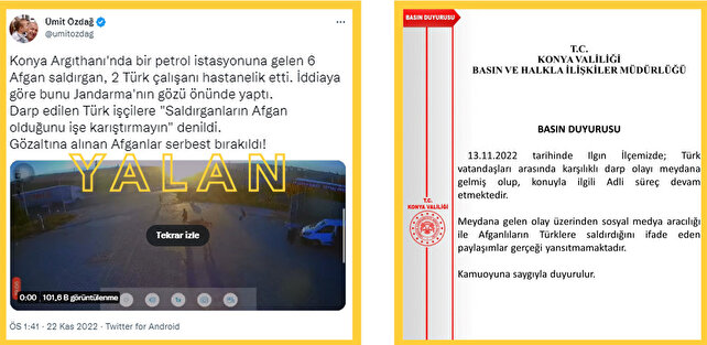 Zafer Partisi Genel Başkanı Ümit Özdağ'ın, "Konya Argıthanı'nda bir petrol istasyonuna gelen 6 Afgan saldırgan, 2 Türk çalışanı hastanelik etti" iddiasının manipülasyon olduğuna işaret edilen bültende, "Özdağ'ın görüntülerini paylaştığı olay, 13 Kasım 2022'de Konya'nın Ilgın ilçesinde meydana gelmiş, Türk vatandaşı gruplar arasında yaşanan karşılıklı darp olayı, adli mercilere intikal etmiştir. Olayın mültecilerle herhangi bir ilgisi bulunmamaktadır." ifadeleri kullanıldı.