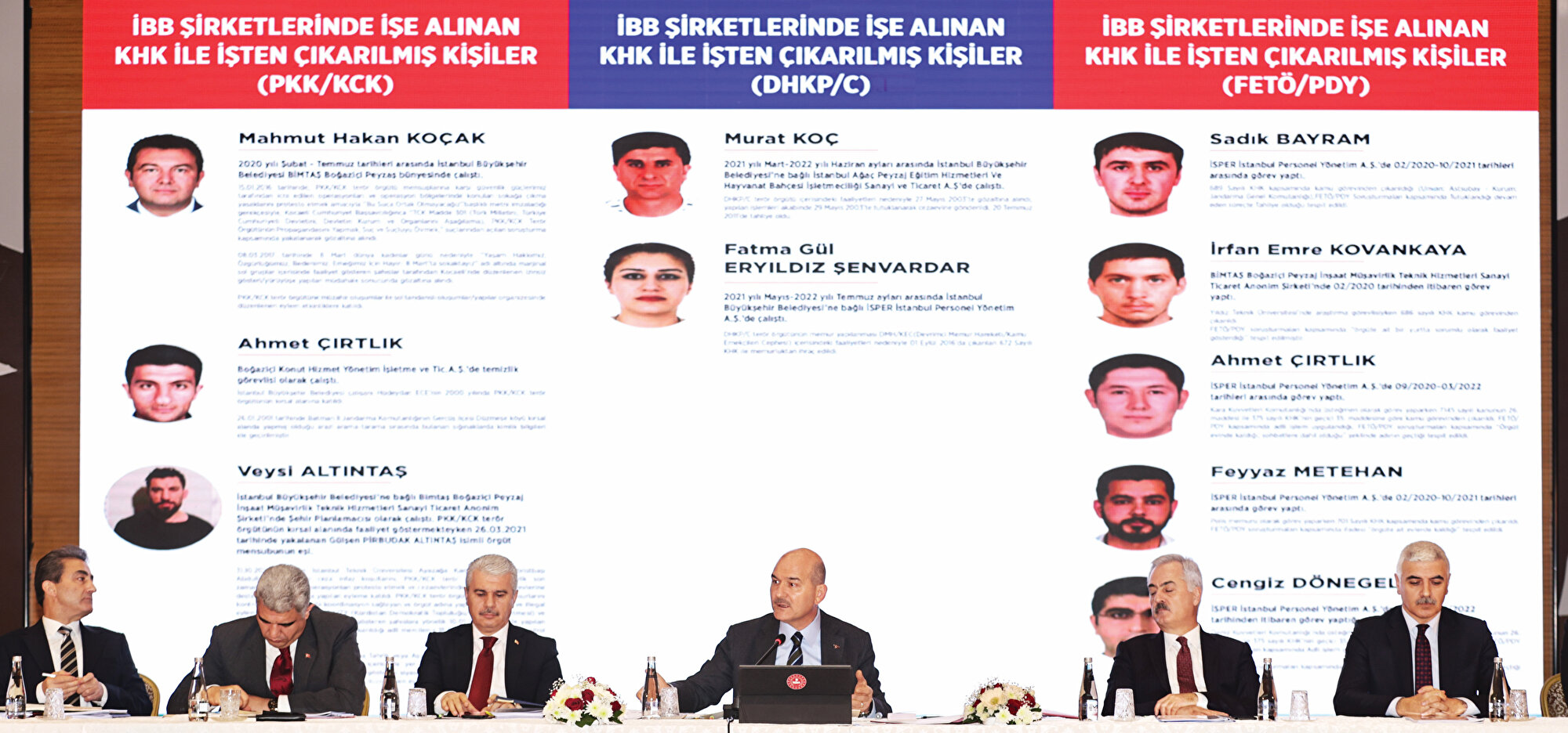 İçişleri Bakanı Süleyman Soylu, belediyelerde yürütülen terör soruşturmaları hakkında açıklamalarda bulundu. Soruşturmaların sadece İBB'de değil tüm belediyelerde yürütüldüğünü anlatan Soylu, anayasal yetkisini kullandığı için eleştirildiğini kaydetti. Terör örgütüyle irtibatı ve iltisakı olan kişilerin İBB ve bağlı şirketlerde işe alınmasıyla ilgili Soylu, “İBB ve belediye şirketlerinde işe alınan 709 kişinin bizatihi kendisi, 959 kişinin 1'inci ve 2'nci derece yakınları dahil olmak üzere 1668 kişinin terör örgütleri ile irtibatlı ve iltisaklı olduğu görülmüştür” dedi. Bunlardan kendisi ve 1'inci derece yakını olan 505 kişi hakkındaki kayıtların, kanunen işe girişlerine mani olabileceği değerlendirildiğinden detaylı incelemeye alındığı bilgisini veren Soylu, “Bu 505 kişi hakkında tekrar yapılan incelemede, 21'i hakkındaki kayıtların işe girişlerine engel olmadığı anlaşılmış, 484'ünün terörle irtibat ve iltisaklı olduğu değerlendirilmiştir. Bu 484 kişiden 36'sının PKK'nın sözde değer ailesi olduğu, 6’sının PKK/KCK'da kırsalda faaliyet yürüttüğü, 21'inin de KHK ile ihraç edildiği tespit edilmiştir. Tamamı İmamoğlu döneminde alınmış, kayıtları kamu görevi yapmalarına engel olacak nitelikte kişilerdir. Sabahki toplantıda ‘Bu kişileri işe almadık’ demedi” diye konuştu.
