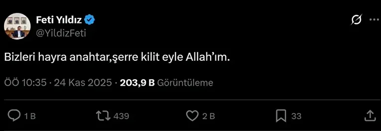 Milli Dayanışma, Kardeşlik ve Demokrasi Komisyonu heyetinin bugün İmralı Adası'nda Abdullah Öcalan ile görüşmesi beklenirken heyetin MHP'li üyesi Feti Yıldız, X hesabından yaptığı paylaşımda "Bizleri hayra anahtar, şerre kilit eyle Allah’ım" ifadelerini kullandı.