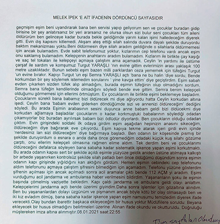 Evde sabit telefonları olmadığını, kızlarının cep telefonunu eşinin sakladığını ve bulamadığını belirten Melek İpek, sözlerini şöyle sürdürdü: "Kelepçenin anahtarını aradım, bulamadım. Kızlarım ile birlikte çay kaşığı ve saç tel tokaları ile kelepçeyi açmaya çalıştık ama açamadık. Kızım C.'nin yardımıyla üstümü çarşaf ile sardım ve komşumuz Turgut Yaraşlı'nın evine gittim. Evleriminiz arası yaklaşık 100 metre uzaklıktadır. Bunun sebebi eşim bazen milli parklardan ceza yememek için tüfeğini Turgut'un evine bırakır.
