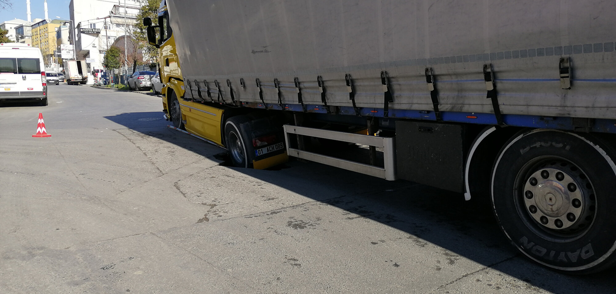 Adana'dan İstanbul'a 14 ton ipliğin getirildiği tır, Bağcılar'da çöken yolda mahsur kaldı. Sokak trafiğe tamamen kapanırken tır için uzun süre çekicinin gelmesi beklendi.