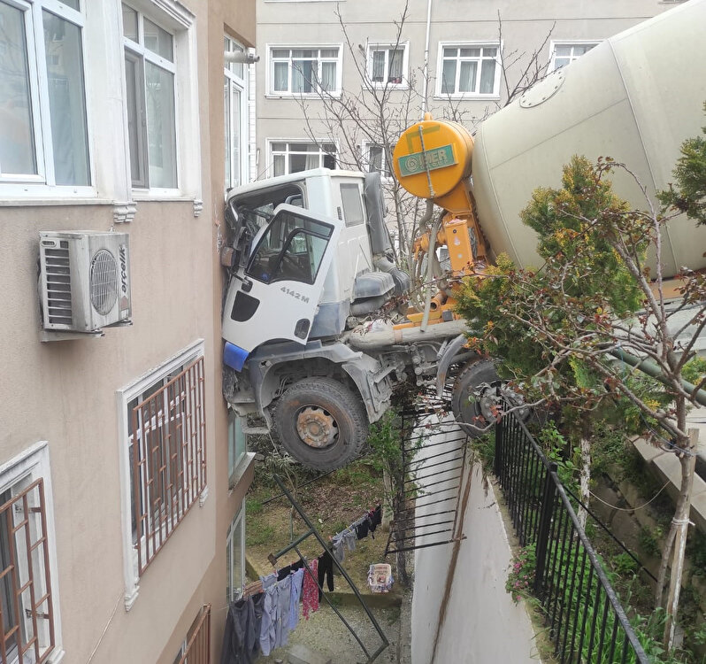Dikilitaş Mahallesi Yeni Gelin Zerde Sokak'ta sürücüsünün direksiyon hakimiyetini kaybettiği beton mikseri, 7 katlı binanın 2. ve 3. katındaki dairelerin duvarına çarptı.