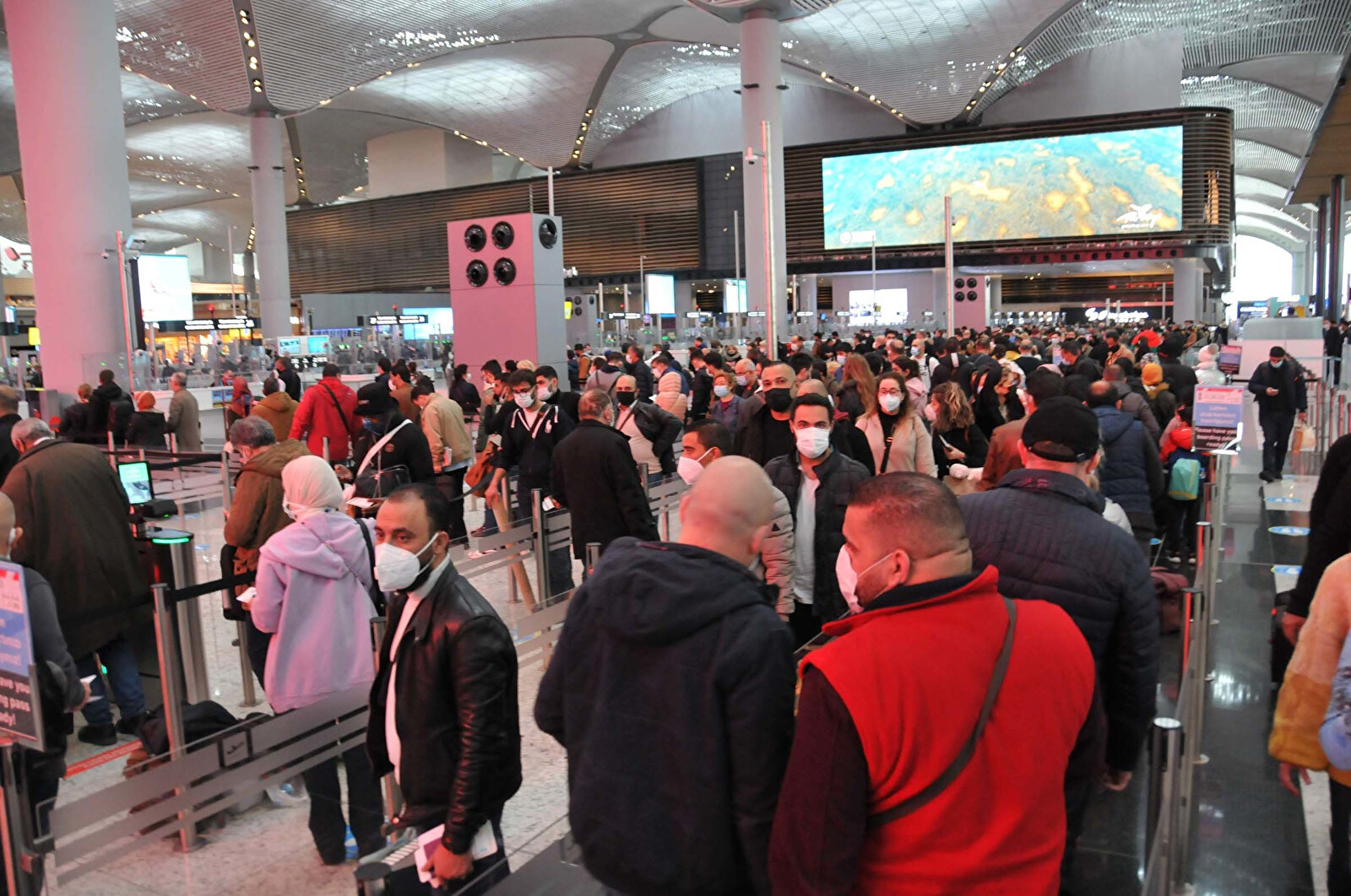 İstanbul Havalimanı, son dönemlerin en yoğun günlerinden birini yaşadı. İç ve dış hatlar bölümünde güvenlik, check-in kontuarları ve pasaport kontrol noktalarında uzun kuyruklar oluştu. Pasaport kontrol noktası önünde sosyal mesafe kuralının ihlal edildiği görüldü.