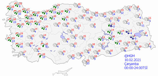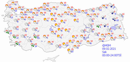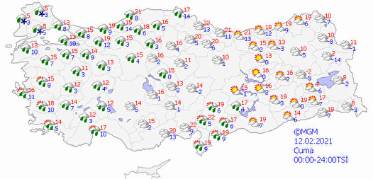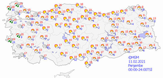 Meteoroloji Genel Müdürlüğü tarafından yapılan son değerlendirmelere göre; Ülkemiz genelinin parçalı yer yer çok bulutlu, Marmara'nın batısı, Kıyı Ege ve Batı Akdeniz'in sağanak ve yer yer gök gürültülü sağanak, gece saatlerinde Erzurum ve Bingöl çevrelerinin hafif kar yağışlı geçeceği tahmin ediliyor. Sabah ve gece saatlerinde iç ve doğu kesimlerde pus ve yer yer sis ile birlikte, doğu bölgelerde buzlanma ve don olayı bekleniyor. Doğu Karadeniz’in iç kesimleri ile Doğu Anadolu’nun güneydoğusunda çığ oluşma tehlikesi bulunmaktadır.