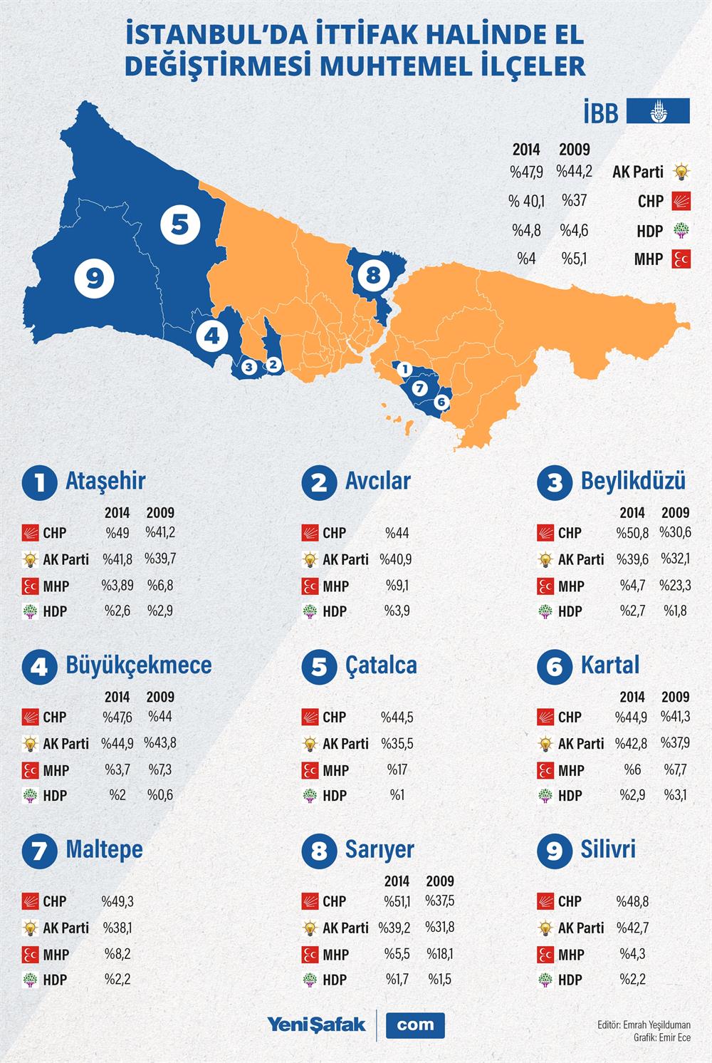 Cumhurbaşkanı Erdoğan'ın 24 Haziran seçimlerinin ardından parti teşkilatına yerel seçimler için verdiği talimatın ardından kısa bir süre sonra MHP lideri Bahçeli'den de sürpriz bir çıkış gelerek "Yerel seçimlerde de ittifak yaparak Cumhur ittifakını devam ettirebiliriz" açıklamasını yaptı. Bu açıklamanın ardından İstanbul'dan aday çıkarmayacaklarını belirten MHP lideri Bahçeli, AK Parti'nin adayını destekleyeceklerini duyurmuştu. Bu gelişmelerin ardından olası bir ittifak halinde geçmiş yıllarda İstanbul'da AK Parti'nin ufak farklarla kaybettiği ilçeler karşılaştırıldığında 9 ilçenin daha AK Parti-MHP ittifakına geçmesi muhtemel görünüyor.