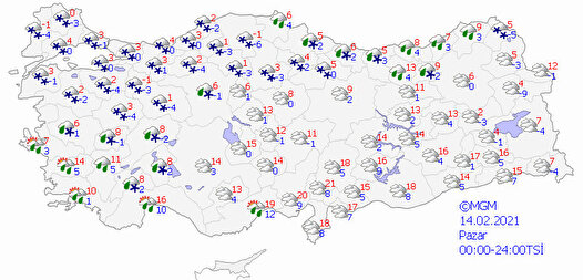 - İstanbul:Havanın, perşembe günü parçalı çok bulutlu, cuma günü ilk saatlerden itibaren aralıklı yağmurlu, cumartesi ise çok bulutlu geçeceği tahmin ediliyor. Pazar günü sabah saatlerinden itibaren karla karışık yağmur ve yükseklerinde kar şeklinde başlayacak olan yağışların, kıyı kesimlerde de zaman zaman kar şeklinde olması bekleniyor.Maksimum sıcaklığın, Perşembe günü 19 derece iken Pazartesi 3 dereceye kadar düşmesi bekleniyor.