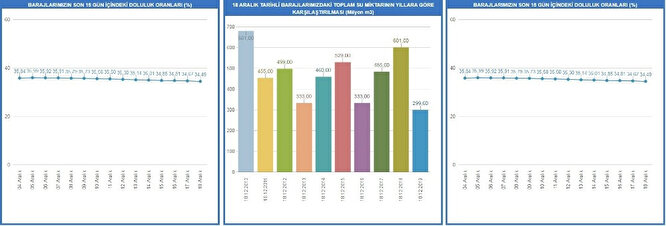 Barajlarındaki doluluk oranı 18 Aralık itibarıyla 34.49 olarak ölçüldü. Bu oran son 10 yılın en düşük seviyesi anlamına geliyor. Bu orana yakın olarak 2016 yılında aynı tarihte doluluk oranı yüzde 38.37 olarak ölçülmüştü. 2013’te ise 38.38 olarak ölçülmüştü.