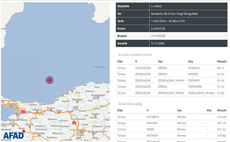4.4 büyüklüğündeki depremin merkez üssünün Zonguldak Ereğli açıkları olduğu ifade edildi.