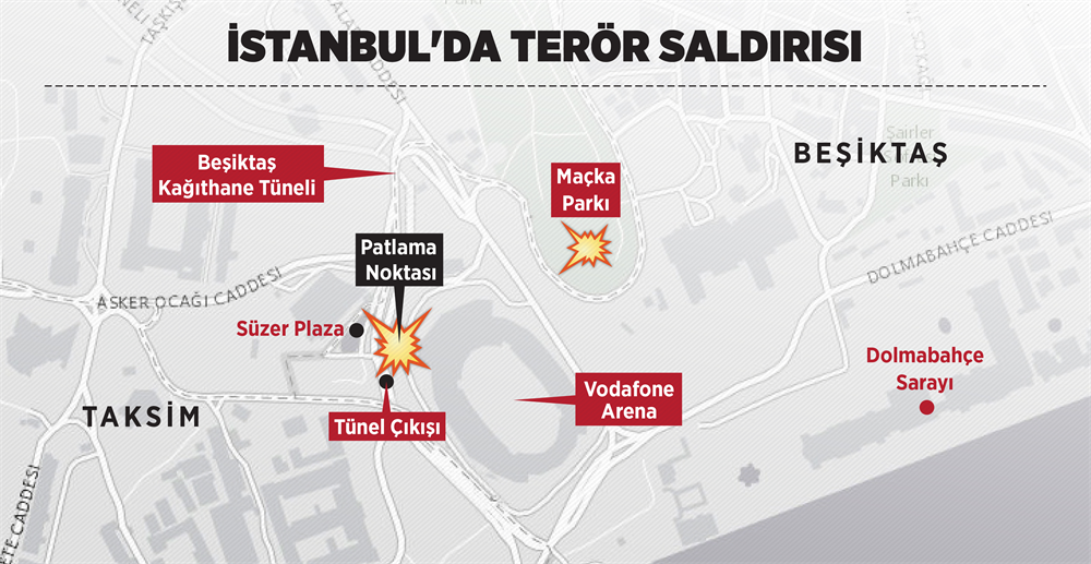 Beşiktaş-Bursaspor maçının ardından saat 22.29'da, 45 saniye arayla Vodafone Arena yakınlarında iki ayrı terör saldırısı meydana geldi. Saldırılarda 27'si polis 29 kişi şehit olurken, 166 kişi yaralandı.