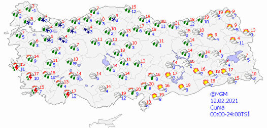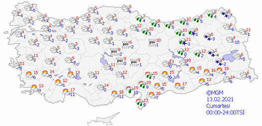 Türkiye geneli için Meteoroloji tarafından yapılan son tahminlere göre, kuzey, iç ve batı kesimlerinin parçalı ve yer yer çok bulutlu, Marmara'nın doğusu, İç Ege, Batı Akdeniz, İç Anadolu'nun kuzey ve doğusu, Karadeniz, Doğu Anadolu'nun kuzeybatısı ile Çanakkkale, Muğla, Erzurum, Muş, Bingöl Adana, Osmaniye ve Kahramanmaraş çevrelerinin yağışlı olacağı tahmin ediliyor.