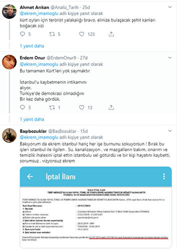 Bu sabah saatlerinde terör örgütü PKK'ya yardım ve yataklık gibi bir çok olay nedeniyle İçişleri Bakanlığı tarafından görevden uzaklaştırılan Diyarbakır, Van ve Mardin Büyükşehir Belediye Başkanları hakkında sosyal medya üzerinden sıcağı sıcağına açıklama yapan Ekrem İmamoğlu'na sosyal medya kullanıcıları tepki gösterdi.