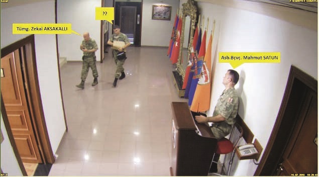 Aksakallı, yanındaki emir astsubayıyla birlikte Personel Başkanlığı koridorundan alt kat merdivenlere yöneliyor. Aksakallı’nın hemen ardından yaklaşık 3 saniye sonra da darbe bildirilerinde ismi bulunan Mehmet Partigöç görüntüye giriyor. Aksakallı, ifadesinde, Partigöç ile koridorda karşılaştıklarını, kendisinin çok telaşlı olduğunu belirtmiş ve “Yüzü adeta kızamık şekeri gibi kıpkırmızı idi” demişti. Aksakallı’nın 19:06:13’te komuta katı yönüne gittikleri, 19:32:38’de de buradan ayrıldıkları görülüyor.
