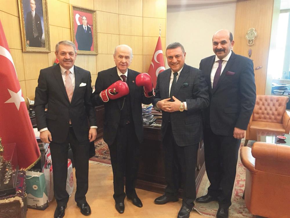Federasyondan yapılan açıklamaya göre, başkan Gözgeç’in yanı sıra asbaşkan Hasan Kartal ve yönetim kurulu üyesi Selçuk Uçan’ı makamında kabul eden Bahçeli, boks eldiveni giydi. MHP Genel Merkezi’nde gerçekleşen ve sporun yanı sıra güncel konuların da gündeme geldiği görüşmede, başkan Gözgeç, beraberinde getirdiği boks eldivenlerini Bahçeli’ye takdim etti. Bahçeli boks eldivenlerini giydikten sonra ise toplu fotoğraf çekimi yapıldı.
