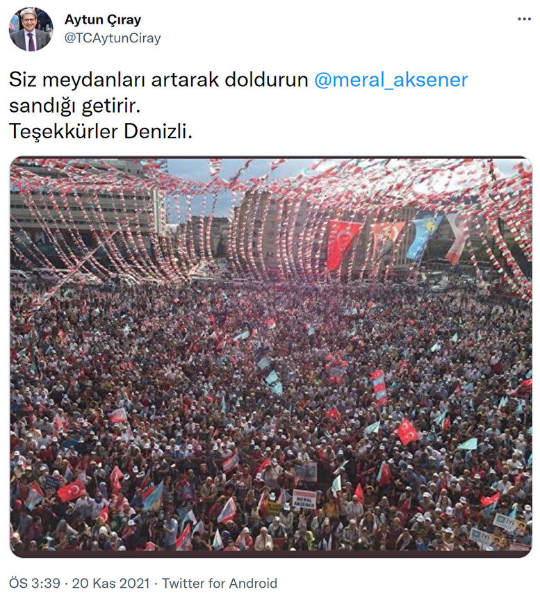 İYİ Parti Genel Başkanı Meral Akşener bugün Denizli'de bir miting düzenledi. Mitingle ilgili paylaşım yapan İYİ Parti Genel Başkan Danışmanı Aytun Çıray ise, 2018 yılındaki Kocaeli mitinginden bir fotoğrafı bugün çekilmiş gibi Twitter hesabından paylaştı. Çıray, paylaşımında "Siz meydanları artarak doldurun Meral Akşener sandığı getirir. Teşekkürler Denizli" ifadesini kullandı.