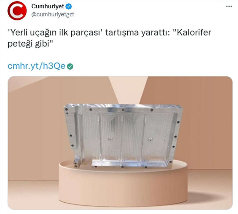 TUSAŞ Genel Müdürü Temel Kotil, dün Türkiye'nin Milli Muharip Uçağı'nın ilk parça üretiminin yapıldığı duyurdu. Milli savaş uçağı için üretilen parçanın fotoğrafını paylaşan İYİ Parti İstanbul Büyükşehir Belediyesi (İBB) Meclis Üyesi Ali Kıdık ise "Kalorifer peteği gibi duruyor" diyerek dalga geçti. Kıdık'a 'Hazmedemiyorlar', 'Tek bldikleri küçümsemek' şeklinde tepkiler gösterildi.