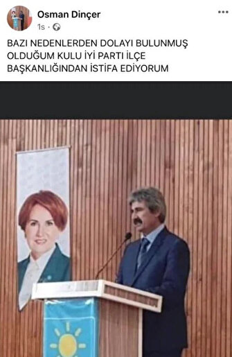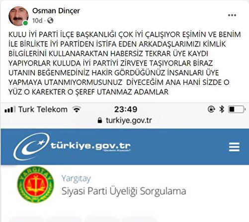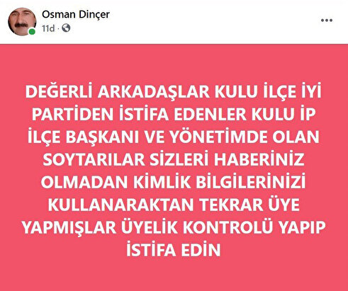 Eski İYİ Parti Konya Kulu İlçe Başkanı Osman Dinçer, İYİ Parti'nin, kendisiyle birlikte istifa eden 400'e yakın kişiyi, kimlik bilgilerini kullanarak habersiz bir şekilde partiye yeniden üye yaptığını söyledi. Sosyal medyadan İYİ Parti Kulu teşkilatından istifa edenlere seslenen Dinçer, "Üyelik kontrolü yapıp istifa edin" dedi.