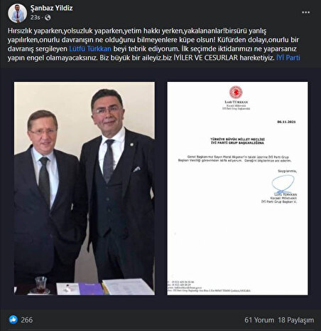 İYİ Parti yönetiminin yaşananlara günlerce sessiz kalması ve herhangi bir yaptırımda bulunmaması tartışma yaratırken, partinin Kocaeli İl Başkanı Şanbaz Yıldız, Türkkan'a sosyal medya hesabından yaptığı paylaşımla arka çıktı.