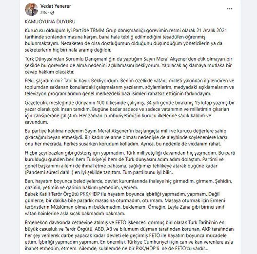 Yenerer, İYİ Parti TBMM Grup danışmanlığı görevinin resmi olarak 21 Aralık 2021 tarihinde sonlandırılmasına karşın, kendisine hala tebliğ edilmediğini ifade ederek, İYİ Parti yönetimine ve Akşener'e ağır eleştirilerde bulundu. İstifa gerekçesine ilişkin açıklamasında şunları söyledi: