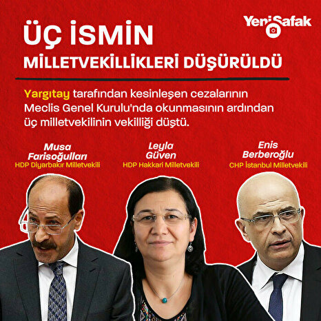 - TBMM Genel Kurulunda, CHP'li Enis Berberoğlu, HDP'li Leyla Güven ve Musa Farisoğulları hakkında mahkeme tarafından verilen, kesinleşmiş cezalara ilişkin Cumhurbaşkanlığı tezkereleri okunarak bilgiye sunulmuştu.