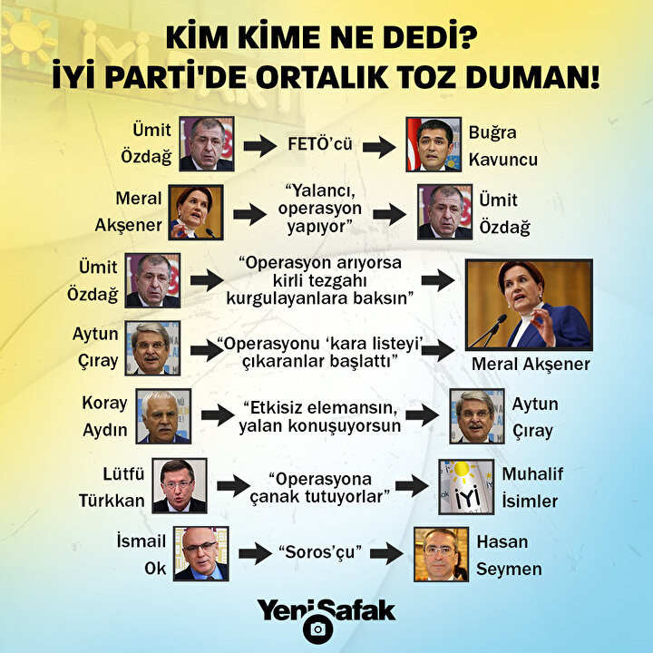 İYİ Parti içinde önce ‘oy verilmeyecekler’ listesi, ardından Ümit Özdağ’ın açıklamaları ve son olarak da Meral Akşener’in “Partiye operasyon yapılıyor” sözleriyle başlayan tartışmalar sürüyor. İYİ Partili isimler, her gün hakarete varan söylemlerle birbirlerini hedef alan açıklamalarda bulunuyor.
