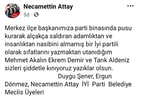 "İYİ Parti Merkez İlçe Başkanımız Zafer Kaya’ya parti binasında pusu kurarak alçakça saldıran adamlıktan ve insanlıktan nasibini almamış bir İYİ Partili olarak sıfatlarını yazmaktan utandığım Mehmet Akalın Ekrem Demir ve Tarık Aldeniz sizleri şiddetle kınıyoruz yazıklar olsun."