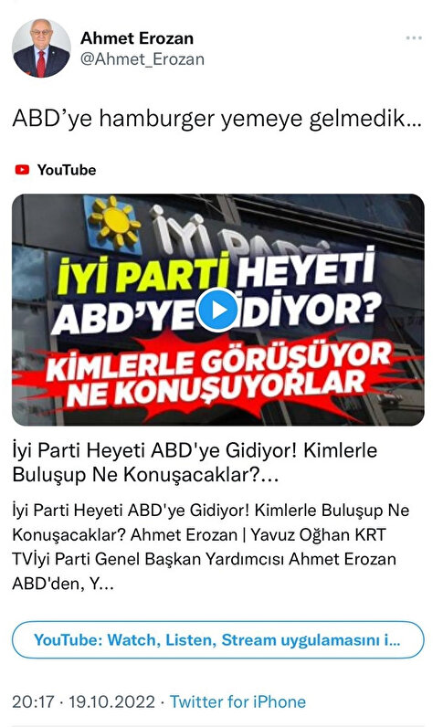 İYİ Parti Genel Başkan Yardımcısı Ahmet Erozan, ABD'deki gizemli sekiz saatinde hamburger yemeye gittiğini söyleyen CHP Genel Başkanı Kemal Kılıçdaroğlu'nu eleştirdi. Kılıçdaroğlu'nun ardından ABD'ye giden Erozan, Twitter hesabından yaptığı paylaşımda "Hamburger yemeye gelmedik" ifadelerini kullandı.