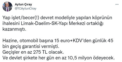 İyi Parti İzmir Milletvekili Aytun Çıray, 1915 Çanakkale Köprüsü projesini geçiş garantisi üzerinden eleştirerek, proje formatını "yap işlet/becer" ifadelerini kullanarak tanımladı.