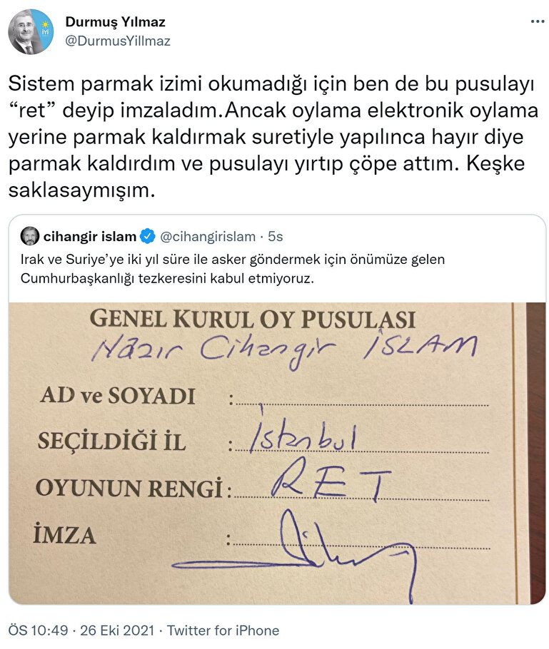 Ancak İYİ Partili bir ismin de HDP'nin çağrısına uyduğu ortaya çıktı. İYİ Parti Genel Başkan Yardımcısı Durmuş Yılmaz, Twitter hesabından yaptığı paylaşımda tezkereye "hayır" oyu verdiğini açıkladı.