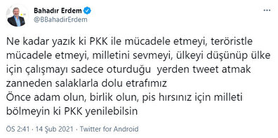 İYİ Parti Genel Başkan Yardımcısı Bahadır Erdem, terör örgütü PKK'nın 13 vatandaşımızı şehit etmesine sessiz kalıp, 14 Şubat için kutlama mesajı yayımlaması sonrası kendisine yöneltilen tepkilere verdiği cevapta halka hakaret etti. Erdem, sosyal medyada tepkisini "Kahrolsun PKK" diyerek gösteren milleti "salak" olmakla ve "halkı bölmek" ile suçladı.