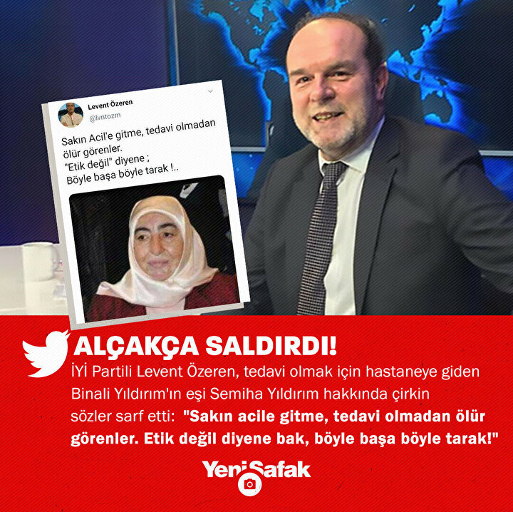 AK Parti İzmir Milletvekili eski Meclis Başkanı ve Başbakan Binali Yıldırım'ın eşi Semiha Yıldırım rahatsızlığı nedeniyle hastaneye gitmiş, İYİ Parti'li Levent Özeren ise sosyal medya hesabından çok çirkin ifadeler içeren bir paylaşım yapmıştı.