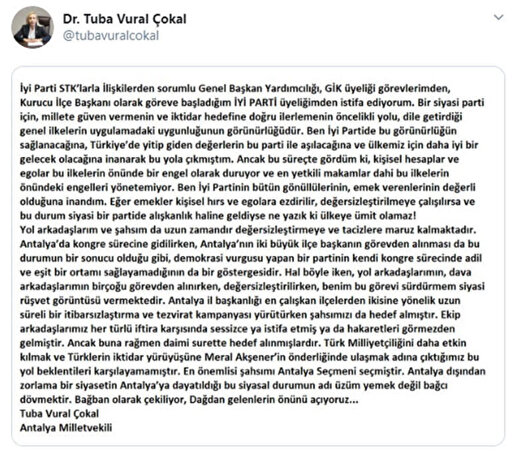 İYİ Parti Genel Başkan Yardımcısı ve Antalya Milletvekili Tuba Vural Çokal partisinden istifa ettiğini duyurdu. İstifasını sosyal medya hesabı üzerinden gece saat 02.00'de duyuran Tuba Vural Çokal, yol arkadaşları ve kendisinin uzun zamandır değersizleştirilmeye maruz kaldığını, Antalya’da kongre sürecine gidilirken, Antalya’nın iki büyük ilçe başkanın görevden alınmasının da bu durumun bir sonucu olduğu gibi, demokrasi vurgusu yapan bir partinin kendi kongre sürecinde adil ve eşit bir ortamı sağlayamadığının da bir göstergesi olduğunu söyledi.