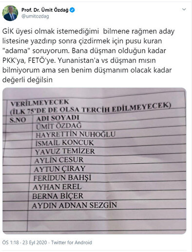 - GİK üyesi olmak istemediğimi bilmene rağmen aday listesine yazdırıp sonra çizdirmek için pusu kuran "adama" soruyorum. Bana düşman olduğun kadar PKK'ya, FETÖ'ye. Yunanistan'a vs düşman mısın bilmiyorum ama sen benim düşmanım olacak kadar değerli değilsin.