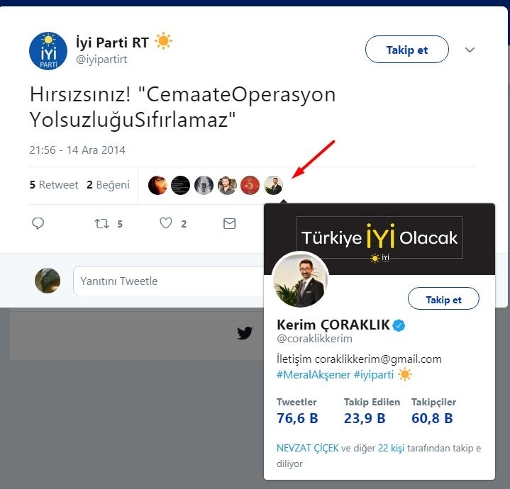 24 Haziran seçimlerine sayılı günler kala FETÖ mensuplarının sosyal medya üzerinden propaganda girişimleri sürüyor. Cumhurbaşkanı adayı Meral Akşener'in genel başkanı olduğu ve muhalefetin dörtlü ittifakında da yer alan İyi Parti'nin iletişim ekibinin başındaki isim Kerim Çoraklık'ın FETÖ'ye destek paylaşımları dikkati çekiyor.